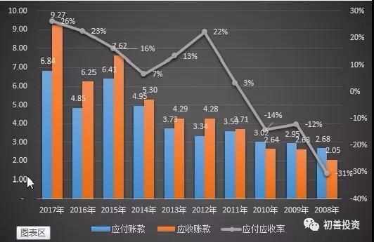 2008年应付应收率为-31%,即应收账款小于应付账款,意味着公司对下游的的议价能力相对较强,即使在2017年增长至26%,也依然远大于平均60%毛利率,可以说上下游的议价能力依然维持在较高水平。