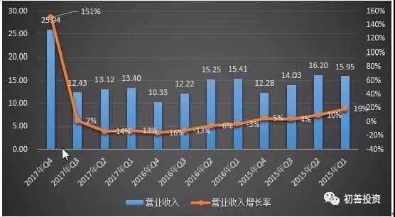 首先从2015年Q1到2017年Q4来看,公司似乎在走深V,尤其是2017年Q4,单季度实现收入25.94亿元,创出上市以来新高,同比增长151%。这或许是公司年报披露后高开高走大涨的主要原因,但是这种增长可以持续吗?