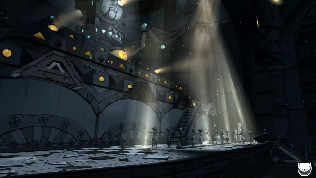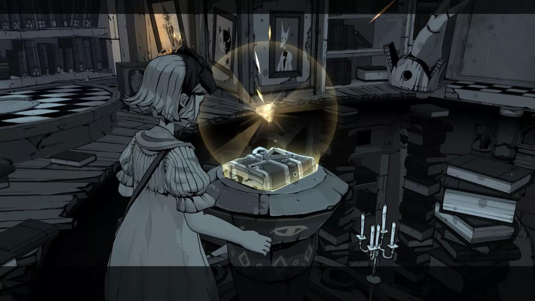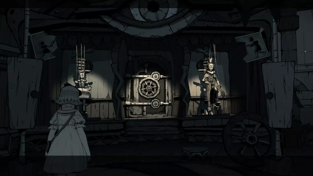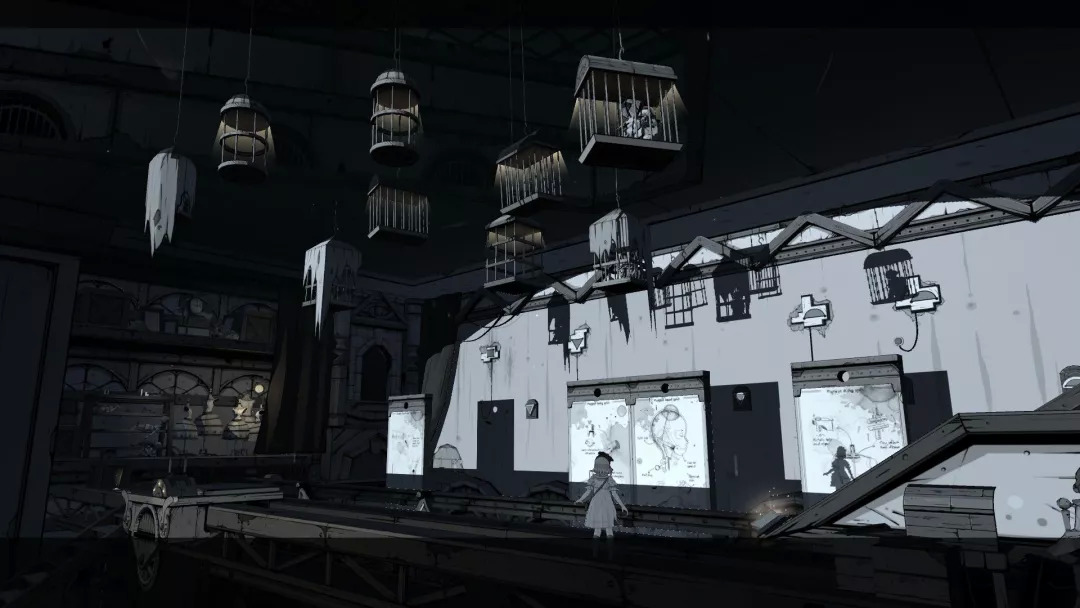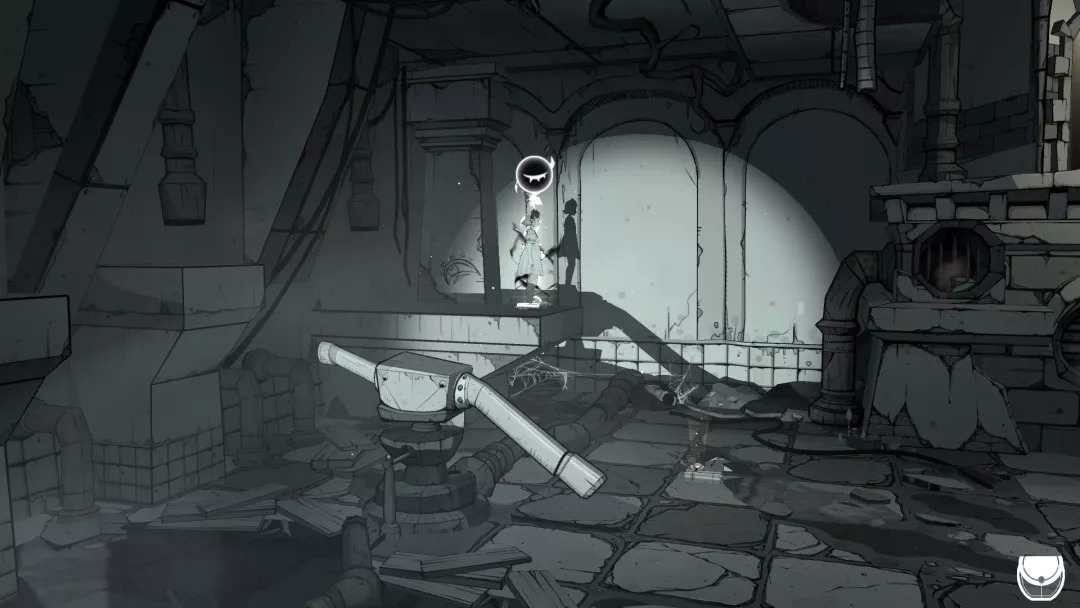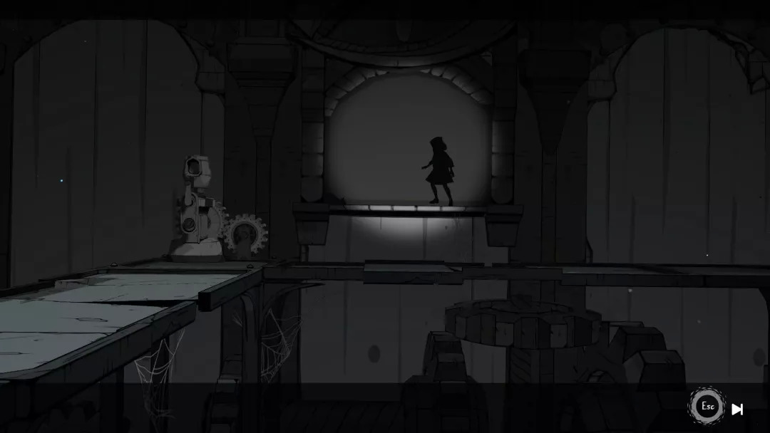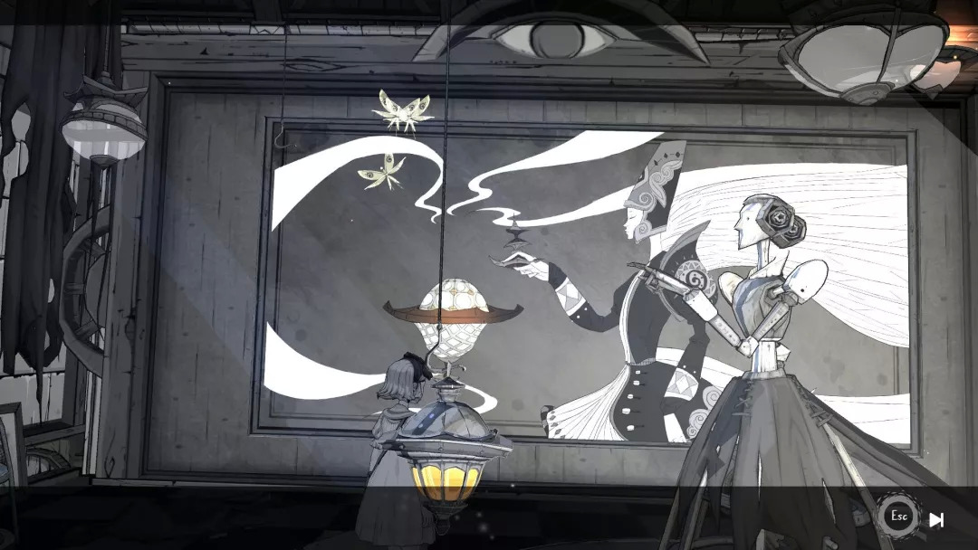 在这种极具幻想色彩的幽暗里徐徐漫步,随着光影变动,翩跹起舞,人偶一动不动着似笑非笑、似哭非哭的嘴角,忽明忽暗的无人楼阁,在纸张上穿梭,在影子里移动,在镜子里穿越,古古怪怪的眼睛,神神秘秘的巨大机器,繁复折叠的机关螺杆,八音盒的音乐里尘埃被吹起……老实说,本作的叙事其实相当隐性,也可以说是没头没尾,但是玩家应该不会觉得有太多突兀或者不适。
