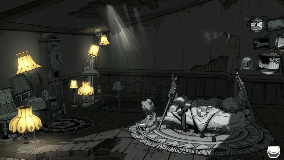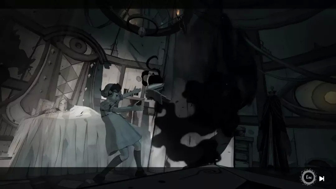 本作的风格十分具有辨识度以及吸引力,或许有那么一点爱丽丝疯狂回归的影子,嗯,不过两者倒也没太多可比性,如果论这种黑白为主色调的3d建模,则让我回忆起另一款游戏《FAR: Lone Sails》,当然,严格说来,其本质都是一种新颖、创造性、实验性的游戏风格——对于这种创新,不得不点个赞。独立游戏的3d建模自然比不上3a大作,而本作为了使画面优化使用的手法是十分精妙的,幽暗色调配合着哥特风的建模,效果炸裂。再穿插着过场的3d动画、部分2d作画,整个游戏风格统一之中又极具个性。