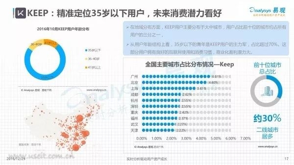 易观智库在《2016在线运动健身市场用户分析》指出,不论是Keep还是咕咚,他们的用户均明显集中于大中城市,北上广占到用户总量的十分之一强,用户占比前10位的城市占到所有用户的三分之一。
