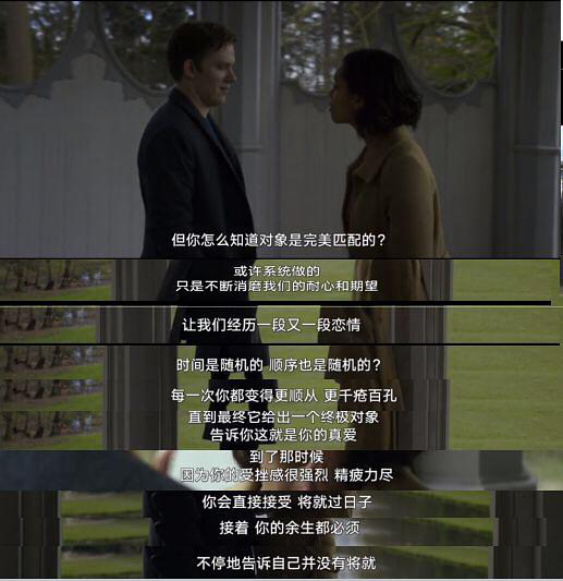 正如《黑镜》中的主角所怀疑的那样,“你怎么知道对象是完美匹配的?或许系统做的,只是不断消磨我们的耐心和期望,让我们经历一段又一段恋情,时间是随机的,顺序也是随机的?每次你都变得更顺从,更千疮百孔,直到最终它给出一个终极对象,告诉你这就是你的真爱。到了那时候,因为你的受挫感很强烈,精疲力尽,你会直接接受,将就过日子,接着,你的余生都必须不停地告诉自己并没有将就。”