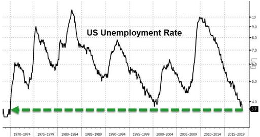11月美国失业率为3.7%,与前值持平,为10年来的低点,也与1969年的水平相同。
