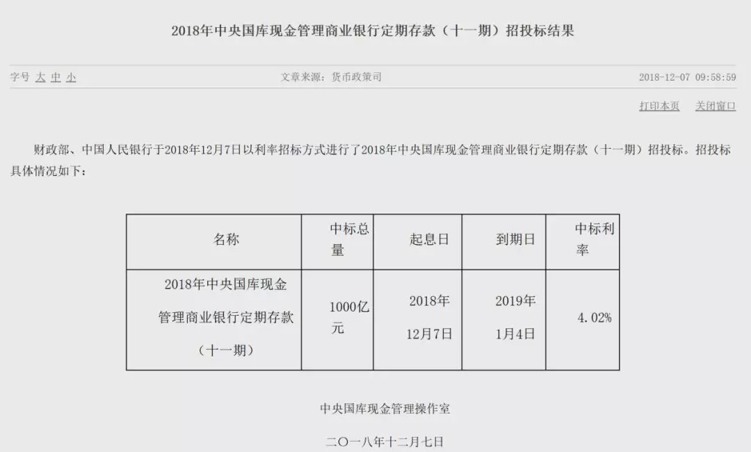 根据央行官网,就在今天(12月7日),最新一期中央国库现金管理商业银行定期存款招投标结果公布。