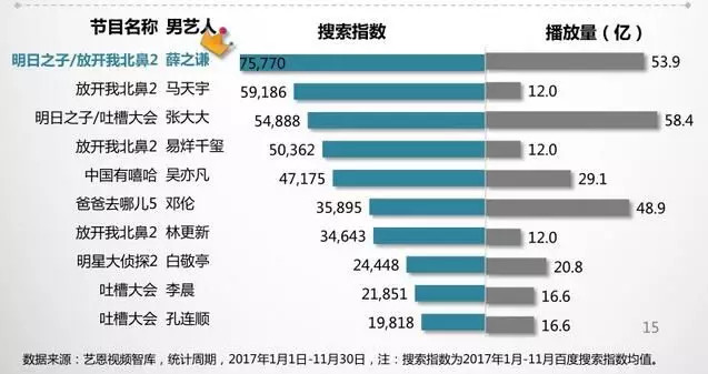 艺恩数据《2017中国网络综艺市场白皮书》显示,网综越来越受大牌明星青睐,头部网综星光闪耀,薛之谦、杨幂分别夺得年度网综最具影响力男女艺人榜单冠军。由于明星的带动,2017年的《吐槽大会》由李小璐、黄婷婷、李晨、孔连顺参与的4期节目播放量均超过了16亿次,位居2017年新播网络综艺播放量男、女艺人榜TOP10。