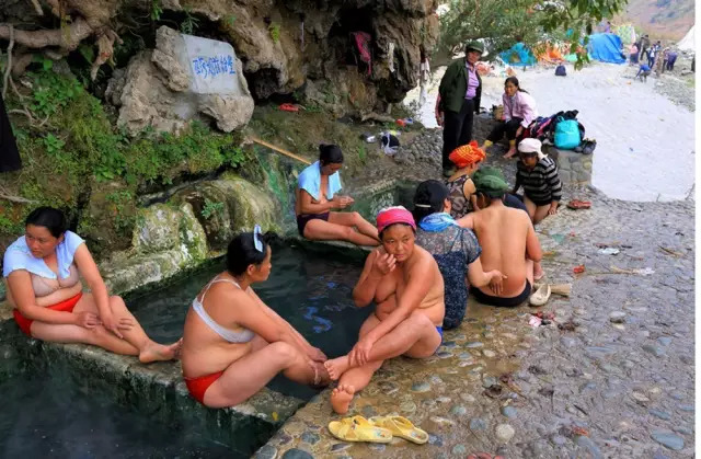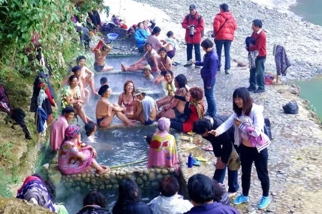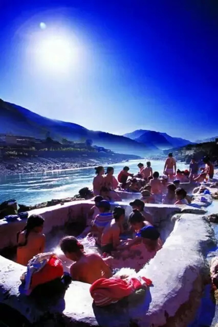 下到那烫人的简易石砌的温泉澡池中。泡在温泉水中,洗去一身的污垢,舒展开筋骨,然后聚集在一起谈天说地,对歌跳舞。男男女女,老老少少,相聚在热气腾腾的温泉水中一边搓洗,一边说笑,嬉戏打闹,其乐融融,好一幅人与自然和谐共存的画面。