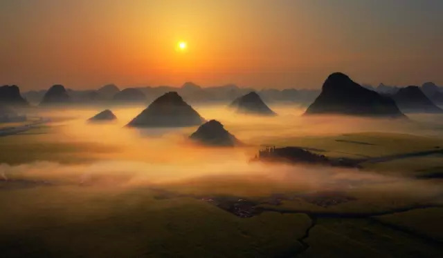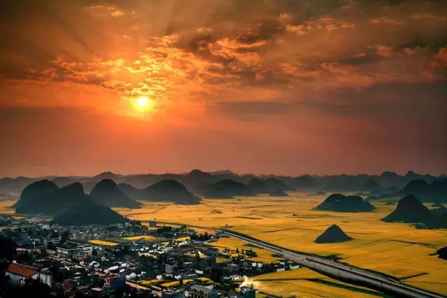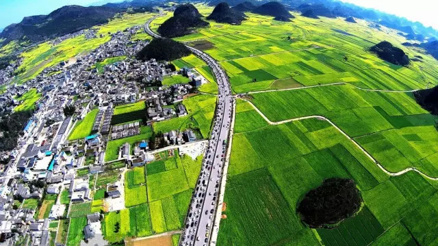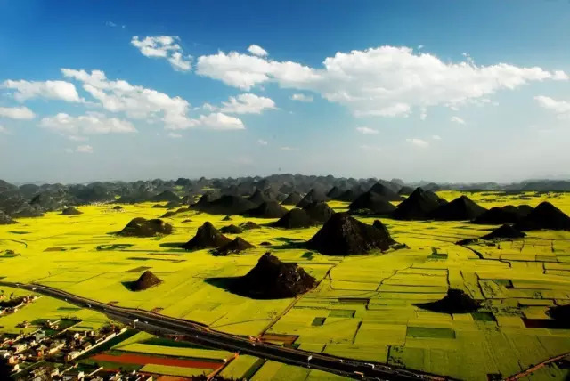 作为春天的信物,罗平80万亩油菜花竟相怒放、金浪翻滚,片片块块、高低起伏、蝶舞蜂飞,清香泌人,有迂回曲折、有螺旋泻落,与远山近水,村落人家相辉映。登上金鸡峰丛,油菜花漫山遍野铺天盖地,秀峰、村舍、道路、河流,皆融汇入油菜花海,近处村落点点,远处孤山耸立,蔚为壮观。