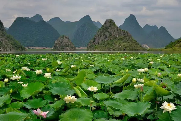 普者黑位于云南省文山壮族苗族自治州丘北县城西北。风景区内的一座座散落的孤峰间,延绵环绕着40里水路、万亩野生荷花、一望无际的桃园和世界最大的岩溶湿地,被誉为“世间罕见、中国独一无二的喀斯特山水田园风光”。区内更可领略到壮、彝、苗、瑶等古朴多姿的少数民族风情。