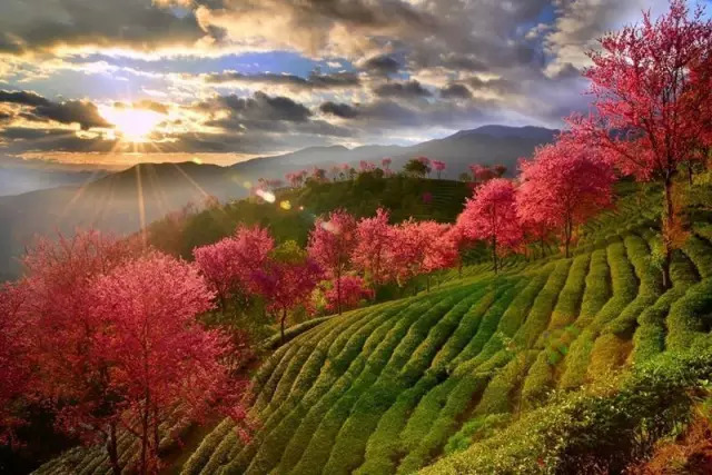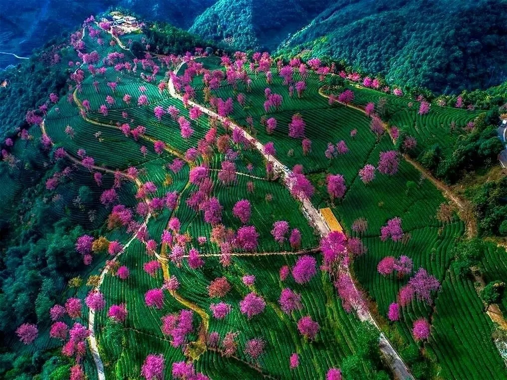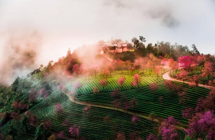 粉红色的花,白色的云雾,绿色的茶园……漫步在云雾缭绕的茶园,碧波翻滚的新绿映衬着如霞似火的粉色樱花,仿佛置身于油画之中!远远望去,一株株樱花与层层茶田相得益彰,谱写着绿茶红樱相恋相守的浪漫乐章。