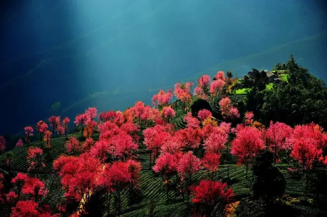 苍翠茶园相伴,幽幽山谷相守,此处正是最孤芳自赏的美好地方。若遇晨雾缭绕,只在迷蒙微光间泄露那红粉的娇俏,就像是欲出仍遮面的少女,不需人识,只能偶遇。