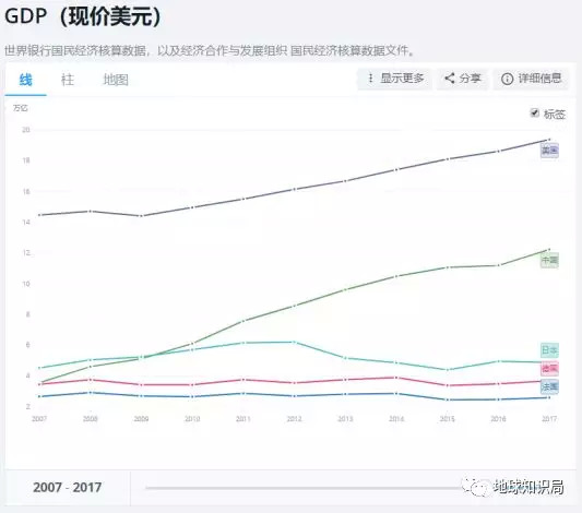 2008年金融危机后,多数主要国家的GDP在经历短暂受挫下滑后迅速在一两年内恢复了增长。然而法国的经济在危机结束后多年丝毫没有起色。比较经济危机前的2007年和2017年的美元计价GDP,可以看到法国这十年来经济不但没有增长,反而较经济危机前缩水了2.9%。
