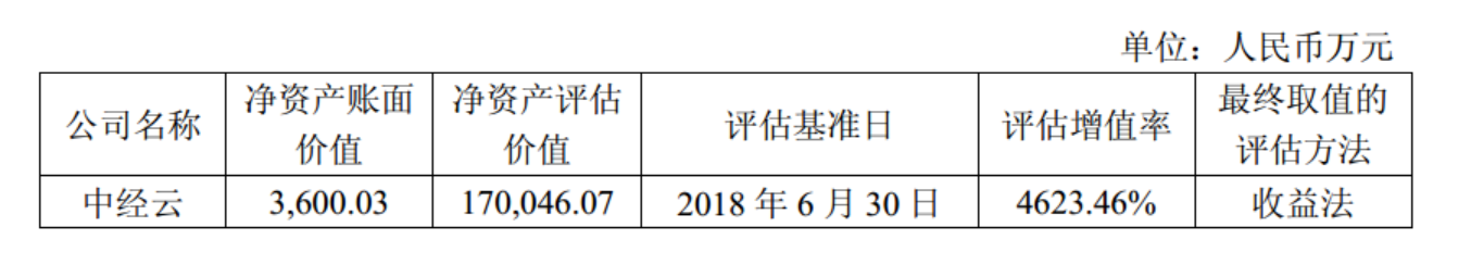 2017年和2018年上半年中经云的营业收入分别为3149.66万元和4416.75万元,净利润分别为-1.14亿元和-5083.51万元。不过好在宁波建工的公告中还另有预测,即2018年下半年、2019年、2020年、2021年、2022年,中经云能分别实现1.3亿元、4.75亿元、7.15亿元、7.81亿元、8.03亿元的营业收入,分别实现-1950.58万元、9323.28万元、2.34亿元、2.27亿元、2.29亿元的净利润。而实际上,宁波建工选择高增值率的收益法评估结果,正是因为“更能准确揭示中经云未来的盈利能力”。