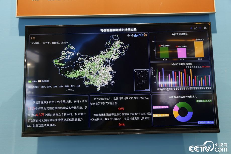 电信普遍服务试点工作2015年年底启动实施,支持13万个行政村通光纤网络,部分行政村和重点海岛、边疆地区覆盖4G网络。截至2018年9月底,我国行政村通光纤比例已达到96%,4G网络覆盖率达到95%,贫困村通宽带比例达到94%,试点行政村平均网络接入速率达到65兆。电信普遍服务管理支撑平台在电子地图上可实时、精准监测13万个行政村网络开通情况。 更多精彩内容请点击浏览:【专题】伟大的变革——庆祝改革开放40周年大型展览_央视网