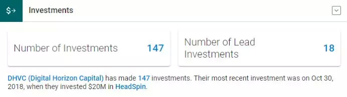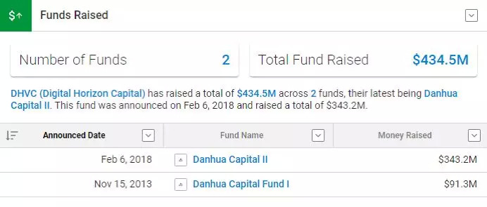 此外,创投数据库Crunchbase(曾为TechCrunch子公司)统计显示,丹华资本(又名Digital Horizon Capital)通过两支基金合计募集资金4.345亿美元,对外投资147个项目,其中18个项目为领投。