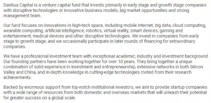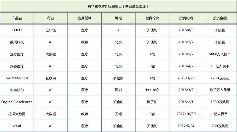 总体上,丹华资本瞄准互联网企业进行投资布局,特别是对采用区块链、人工智能、大数据技术的科技创新企业情有独钟。