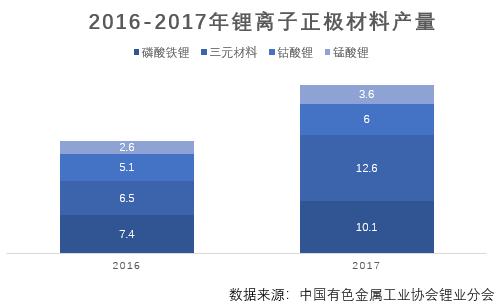 中国有色金属工业协会锂业分会(下称锂业分会)的数据显示,2017年全国正极材料产量约为32.3万吨,同比增长49.54%。其中三元材料以93.85%的增速,成为2017年增长最快的正极材料,钴酸锂产量增速为17.65%。此外,从产值来看,2017年国内正极材料产值413亿元,同比增长98.56%。