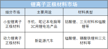 锂电正极材料市场分为小型锂电、动力锂电正极材料两种。小型锂电正极材料主要用于手机、笔记本电脑等3C用锂电池产品,包括钴酸锂、三元材料和锰酸锂;动力锂电正极材料主要为锰酸锂、磷酸铁锂和三元材料。