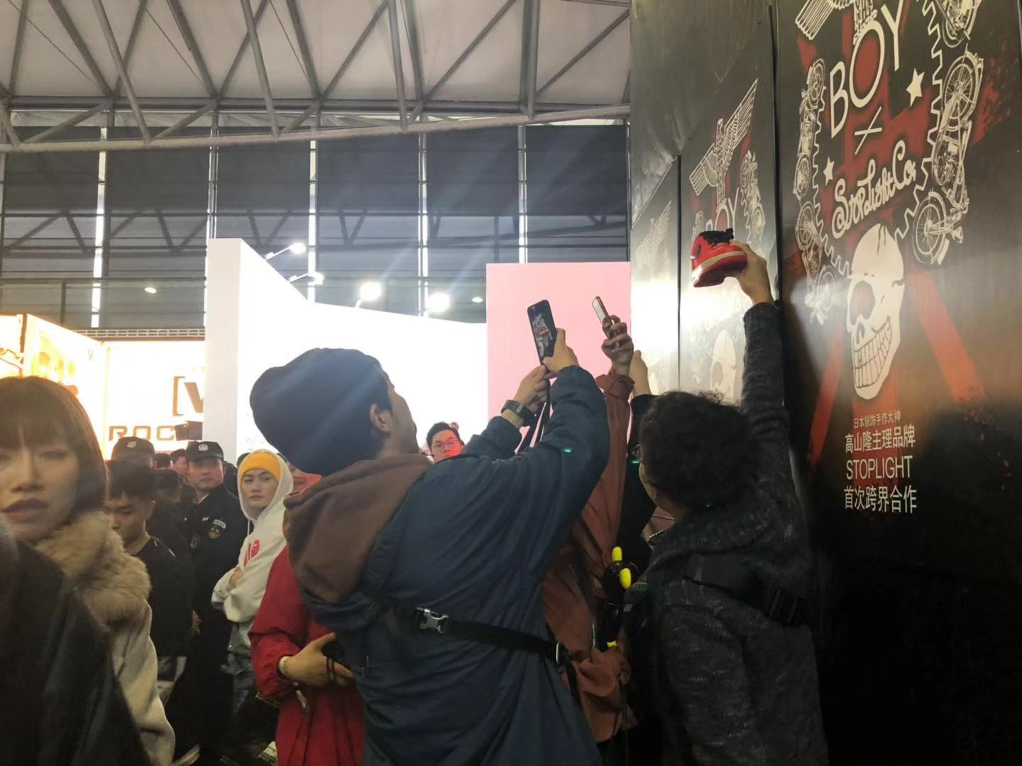 刚一进会场,就看到乌泱泱的人群排在陈冠希签售的展台前。一个男孩兴奋地举着一只有签名的Nike鞋冲出了队伍,几个朋友和路人迅速围了上来。他们一边不停地给这只鞋拍照、抱着它合影,一边羡慕地喊着:“我靠!”、“牛啊!”众人激动不已,还有人抱着鞋亲了一口。