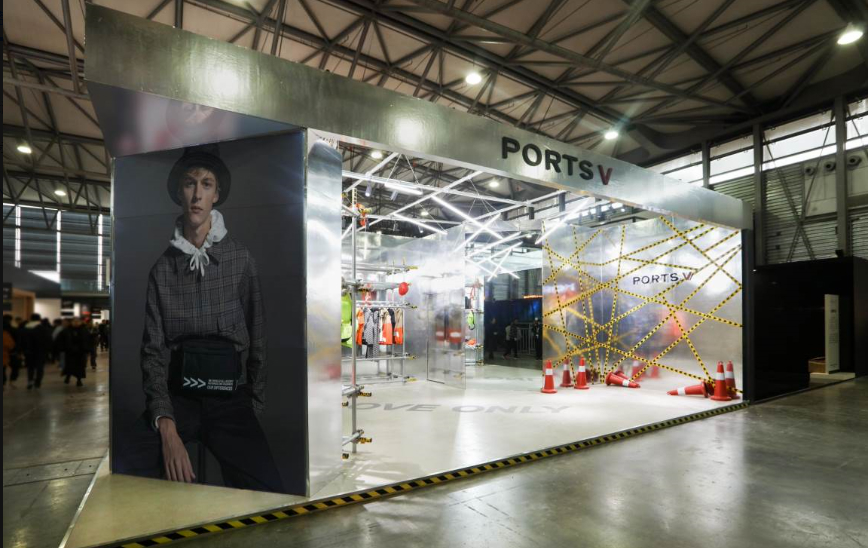 PORTS今年5月推出的年轻潮牌PORTS V还原了一个“工地现场”,用水泥、脚手架、警示带等工业风元素搭起了展台和货架,货架上展示的是最新季的美式风格工装。