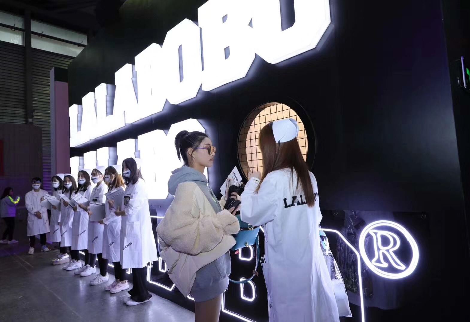 LALABOBO把展位设计成了一个“医院”,里面有病床、点滴和沉浸式“泳池”。走出展位时,还会有工作人员扮演的“医生”会祝贺出院,并发给参观者装有“药物”的小纸袋,其实里面是小糖豆。