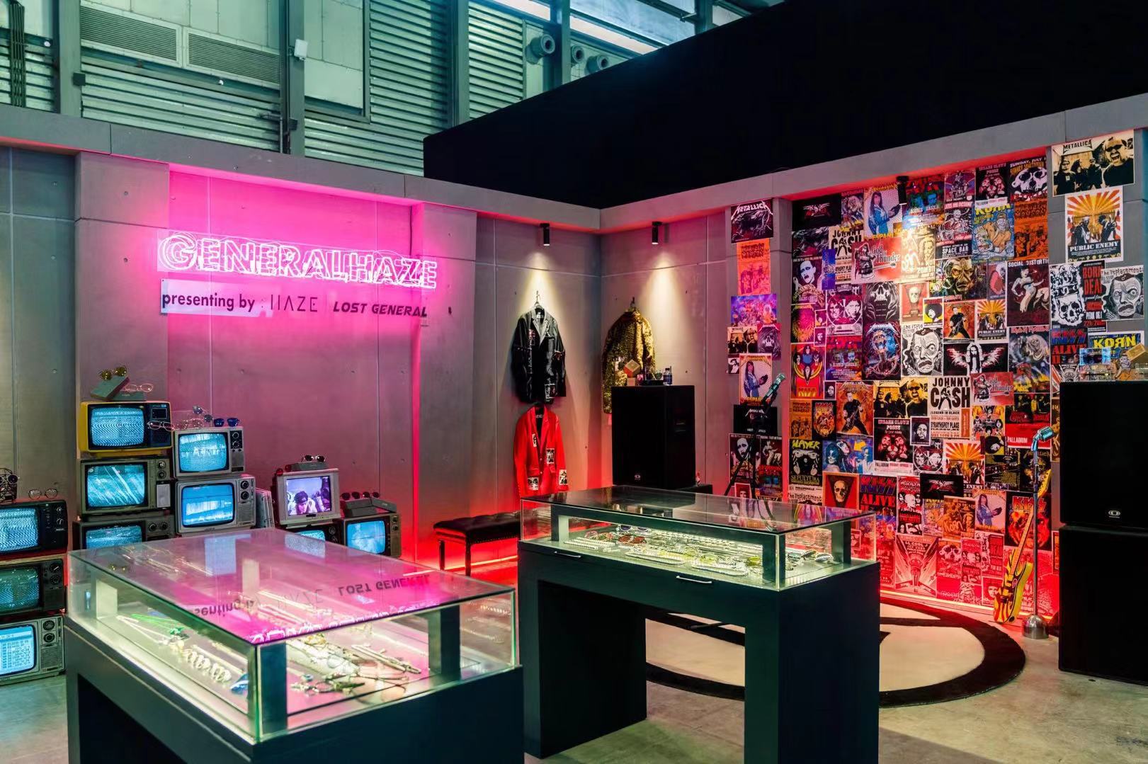 设计师品牌HAZE Collection和LOST GENERAL的联名配饰系列GENERALHAZE,把展位布置成了一个地下摇滚区域。贴满了复古海报的墙成了受欢迎的拍照点,复古电视机、音响和滑板等老物件在暧昧的霓虹灯照射下,显得十分朋克。