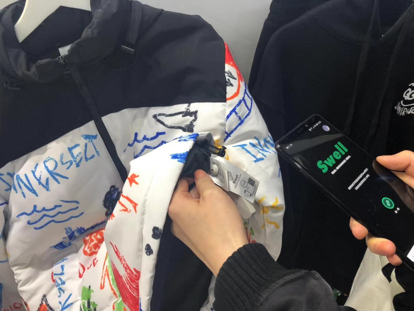 可以看到,为了体现潮流感,许多展台都运用了高科技元素。而在Innersect发售的许多产品中,区块链潮流社区Swell还埋入了芯片。近几年,区块链技术正热,服装产业对它的运用则是在衣服中置入可浸水的芯片,消费者扫描标签上的条码后便可看到这件衣服的“前世今生”。例如服装的生产地、经过的工序、各种材质的来源,对于转售产品来说,还能查询到这件服装过去的主人和经历。