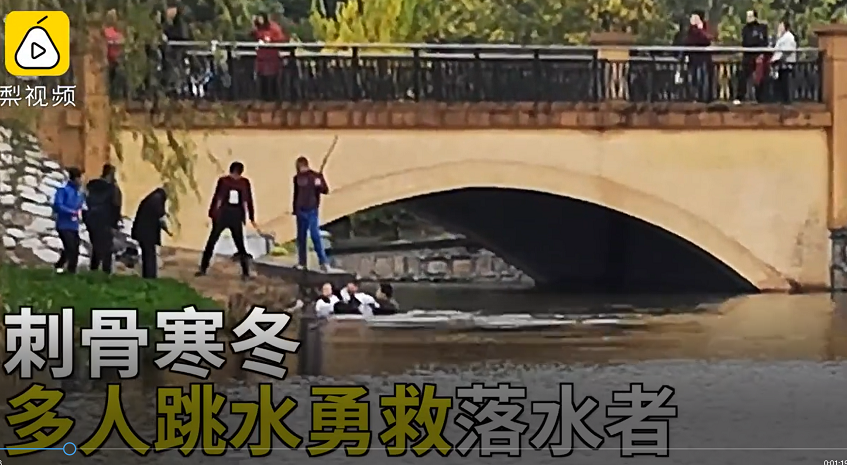 图说:岸上其实有不明真相的群众,但还是浦东新区机关足球队的队员们,在危机时刻不顾生命危险跳入冰冷河中救人。