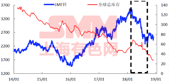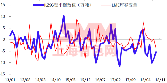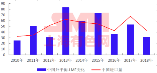 除中国外平衡(冶炼厂产量-表观消费量)与LME锌库存变动的差值与中国锌进口量应当存在一致性。2013-2015年,大量库存隐形化消失。而2016-2018年,是隐性库存显性化的过程,粗略推算,全球库存低位可以排除隐性化的干扰。