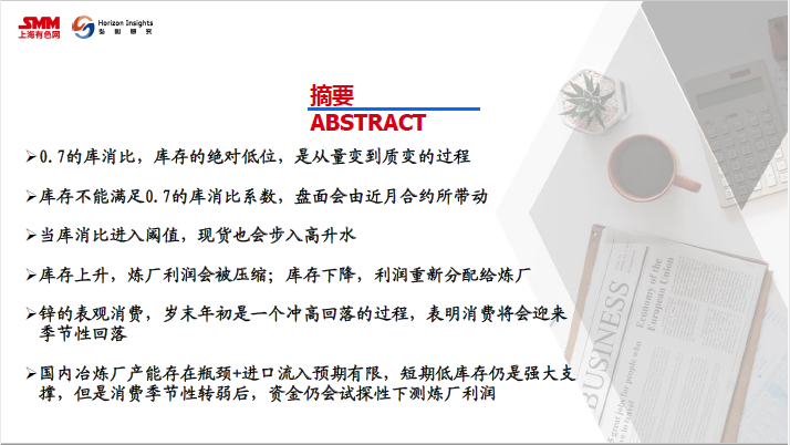 SMM12月10日讯:2018年12月5日,弘则研究与上海有色金属网展开深度合作,上海有色金属网锌行业分析师李灵对于目前锌市低库存概念下炼厂利润分配情况做了详细解读。李灵表示:“国内冶炼厂产能存在瓶颈+进口流入预期有限,短期低库存仍是强大支撑,但是消费季节性转弱后,资金仍会试探性下测炼厂利润,锌价或仍将处于区间震荡状态,但上测动力或将逐步减弱。”。