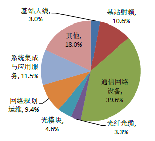 在投资方面,申万宏源研究预计我国三大运营商5G 总投资有望超过1.3 万亿元,相较于4G 时代增长超过60%。每个产业链环节的投资占比不同,其中通信网络设备占比最大,近40%,基站天线、射频、光纤光缆和光模块的投资占比分别为3%、10.6%、3.3%、4.6%。
