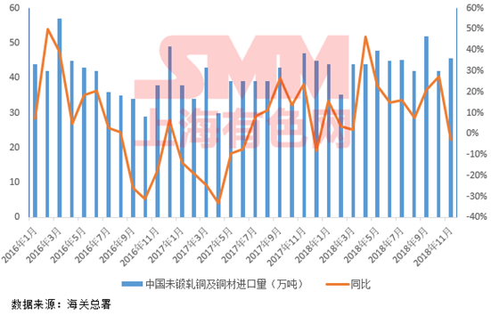 SMM 12月10日讯:中国海关总署周六公布的数据显示,中国11月未锻轧铜及铜材进口量为45.6万吨,环比增加8.6%,但同比减少3%。中国1-11月未锻轧铜及铜材进口量为486.9万吨,同比增加14.9%。
