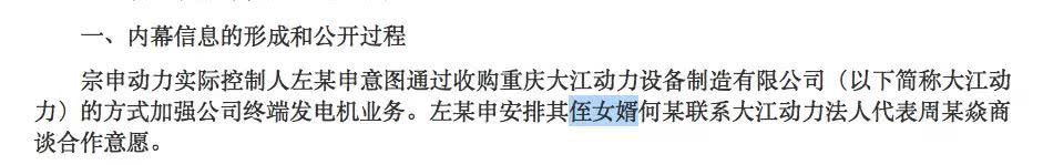 在2017年8月宗申动力收购大江动力期间,袁媛的丈夫何某,也就是左宗申的侄女婿是该次交易的联系人。