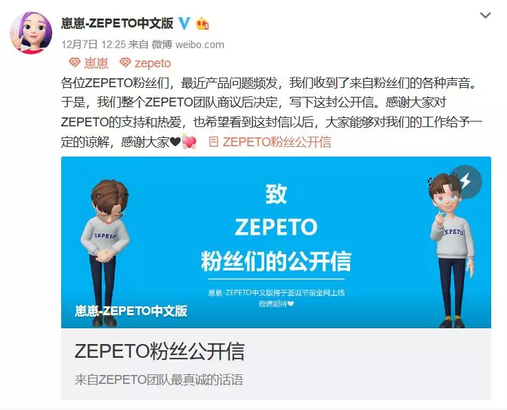 12月7日,ZEPETO针对游戏卡顿、安卓用户暂停使用的问题在微博发出公开信表示,他们对服务器负荷过大导致的产品体验较差、无法覆盖所有用户表示抱歉。为了减少用户利益受损,所以暂停了ZEPETO在中国地区安卓用户的服务,希望广大用户可以等待半个月之后上线的崽崽-ZEPETO中文版。