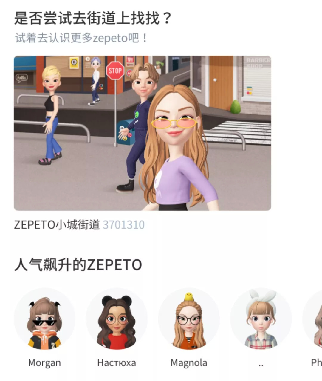 ZEPETO在发现板块中还开放了一个小城街道功能,不过国内用户暂时还无法进入。在小城街道的下方,还会显示一些短期内人气飙升的用户。