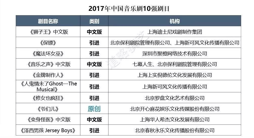 十数年过去,引进剧目依旧牢牢占据着音乐剧市场的半壁江山。不完全统计,2017年至少有35部有一定影响力的音乐剧进入了大众视线,但只有一部中文原创作品最终迈进了年度票房前十。