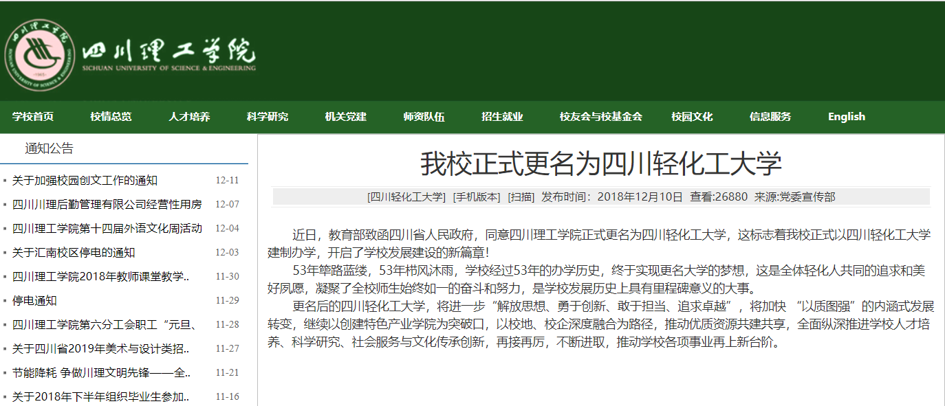 四川理工学院官网消息,近日,教育部致函四川省人民政府,同意四川理工学院正式更名为四川轻化工大学。以下为原文: