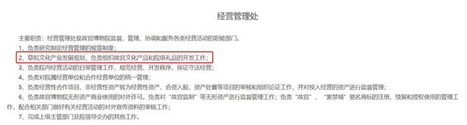 “文创馆”归属于故宫博物院经营管理处,在故宫博物院官网上可以查到它的职务范畴,“负责组织故宫文化产品和院级礼品的开发工作”。