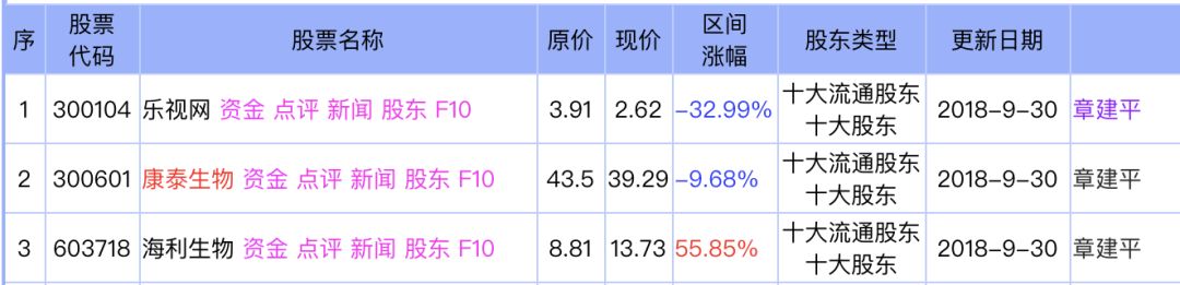 据野马财经不完全统计,截止到2018年三季度末,章建平是乐视网(300104.SZ)、康泰生物(300601.SZ)、海利生物(603718.SH)三家A股上市公司的前十大股东。