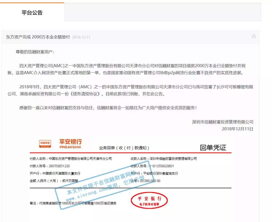 近日消息,P2P平台信融财富在其官网宣布,四大资产管理公司(AMC)之一中国东方资产管理股份有限公司天津市分公司对信融财富的项目借款2000万本金已全额垫付并到账,这是AMC介入网贷资产处置正式落地的第一单。