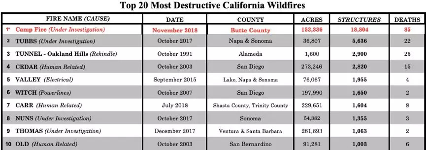 加州史上最严重的10起山火,坎普山火造成的死亡人数比后4位加起来还多,来源:CAL Fire