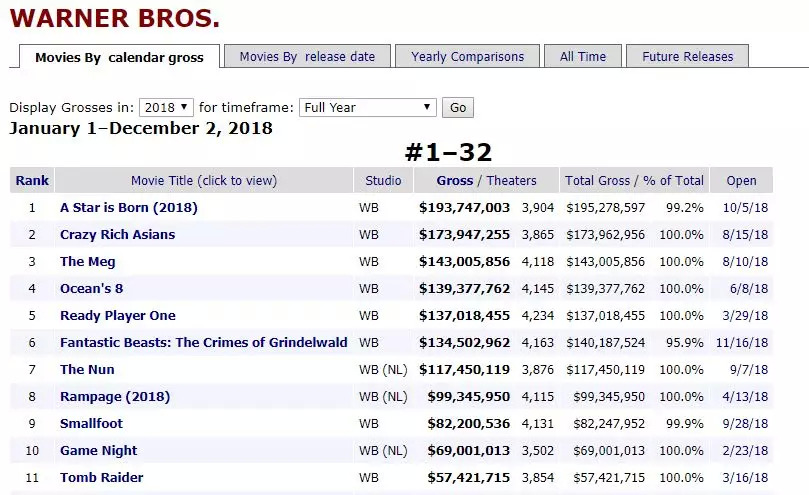 从11月16日《神奇动物:格林德沃之罪》,到11月30日中国上映的全球最大票房黑马《摘金奇缘》,再到另外一部DC大作《海王》,2018年岁末的全球票房注定是由这家六大发行公司在主导——华纳兄弟。