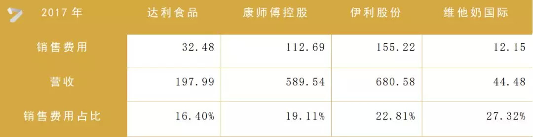 达利园让利经销商,让其销售费用在同梯队企业里处于最低。(单位:亿元)