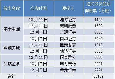 根据当时公告,莱士中国质押给开源证券的8800万股、质押给国海证券的3240万股,合计1.20亿股的股票质押回购交易因部分金额逾期构成违约;科瑞天诚质押给信达证券的3800万股股票,科瑞金鼎质押给申万宏源证券的5901万股股票、质押给金元证券的2221万股股票,合计1.19亿股股票质押回购交易因部分金额逾期也构成违约,质权人也有权对涉及违约的股票进行减持。