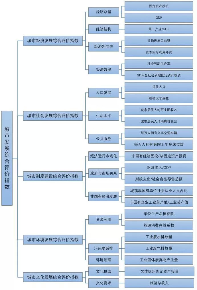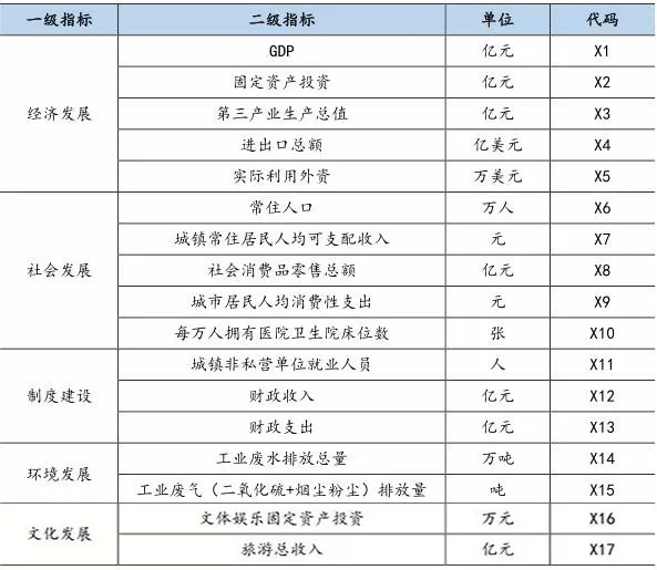 本文以“五位一体”总体布局为指导思路,将文化发展和制度建设融入评价指标体系,构建包含经济、社会、文化、环境和制度建设的城市发展质量综合评价指标体系。