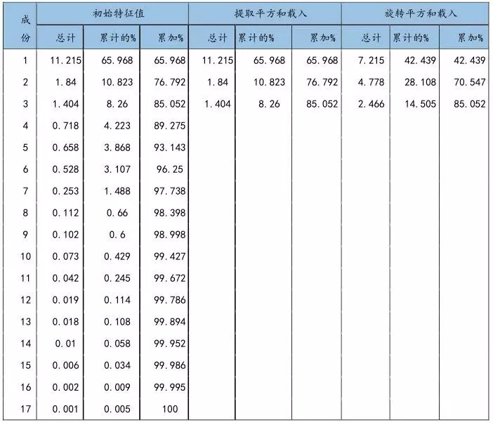 对标准化后的数据进行因子分析,得出因子特征值和累积方差贡献率以及相应的碎石图。根据特征值大于1的原则提取三个主因子,由累计贡献率可得,取前三个主因子其累计方差贡献率达到85.052%,说明前三个主因子可以代表原始数据的绝大多数信息。