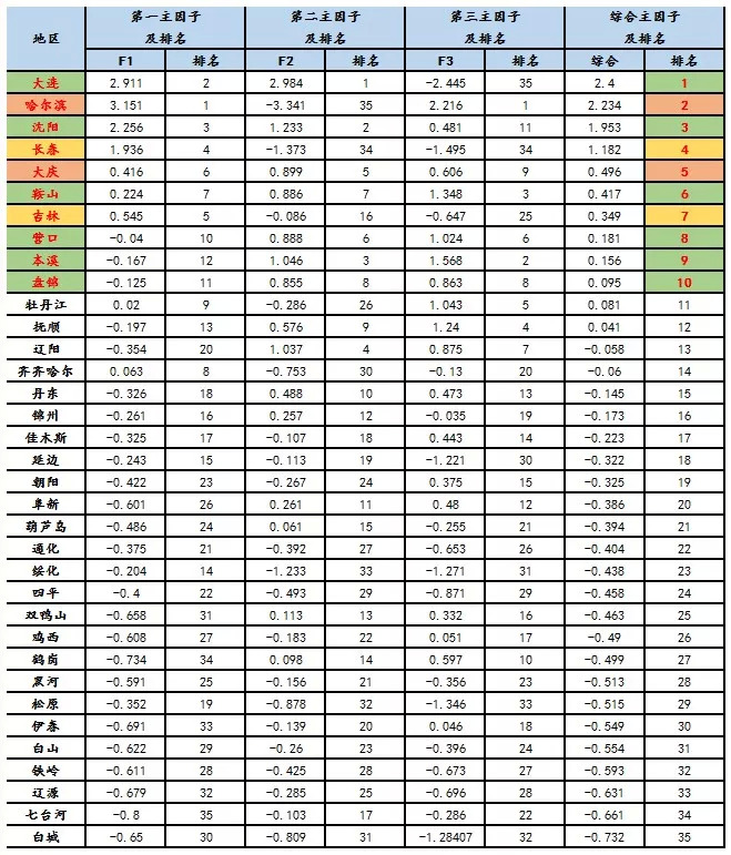 表:东三省城市发展水平综合评价各主因子得分及排名