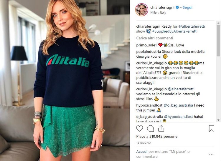 Alberta Ferretti、意大利航空Alitalia和Chiara Ferragni等博主的交易在报告中被作为了例子。今年6月,Alberta Ferretti为该公司员工设计了新制服。而博主们穿着这些衣服拍了照片,发在了自己的社交媒体上,意大利航空Alitalia的logo标识清晰地展示在他们的胸前。