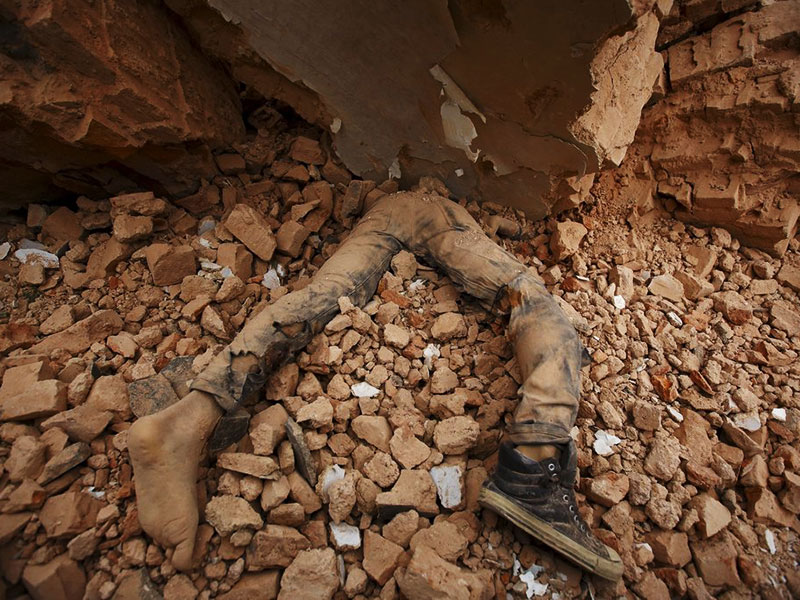 4月25日下午2点11分,尼泊尔发生8.1级地震,震源深度20公里,震中位于旅游城市博卡拉和首都加德满都之间。图为加德满都废墟中的遇难者遗体。