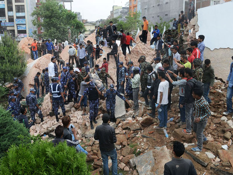 4月25日,加德满都地震现场。地震发生后,喜马拉雅山也发生了雪崩,与该国交界的西藏日喀则吉隆县、聂拉木县等邻近地区震感强烈,有房屋倒塌情况。