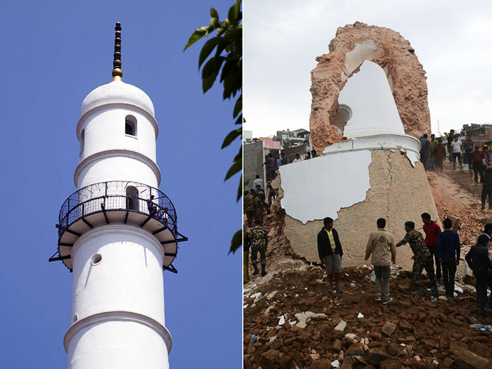 4月25日,加德满都的主要地标、始建于1832年的比姆森塔(Bhimsen Tower)在地震中倒塌,搜救人员从废墟中抬出了至少180具遇难者遗体。左图为达拉哈拉塔资料图,右图为尼泊尔8.1级地震之后达拉哈拉塔坍塌后景象。